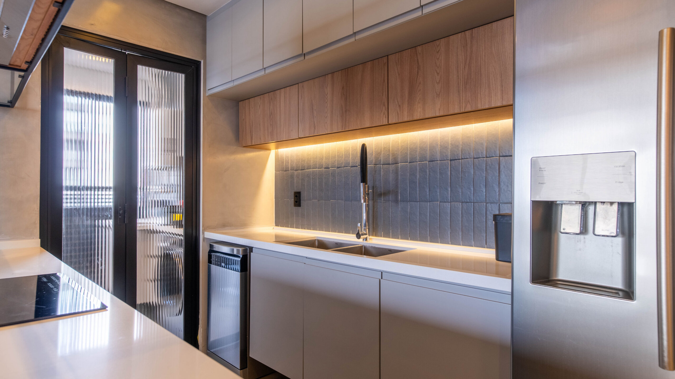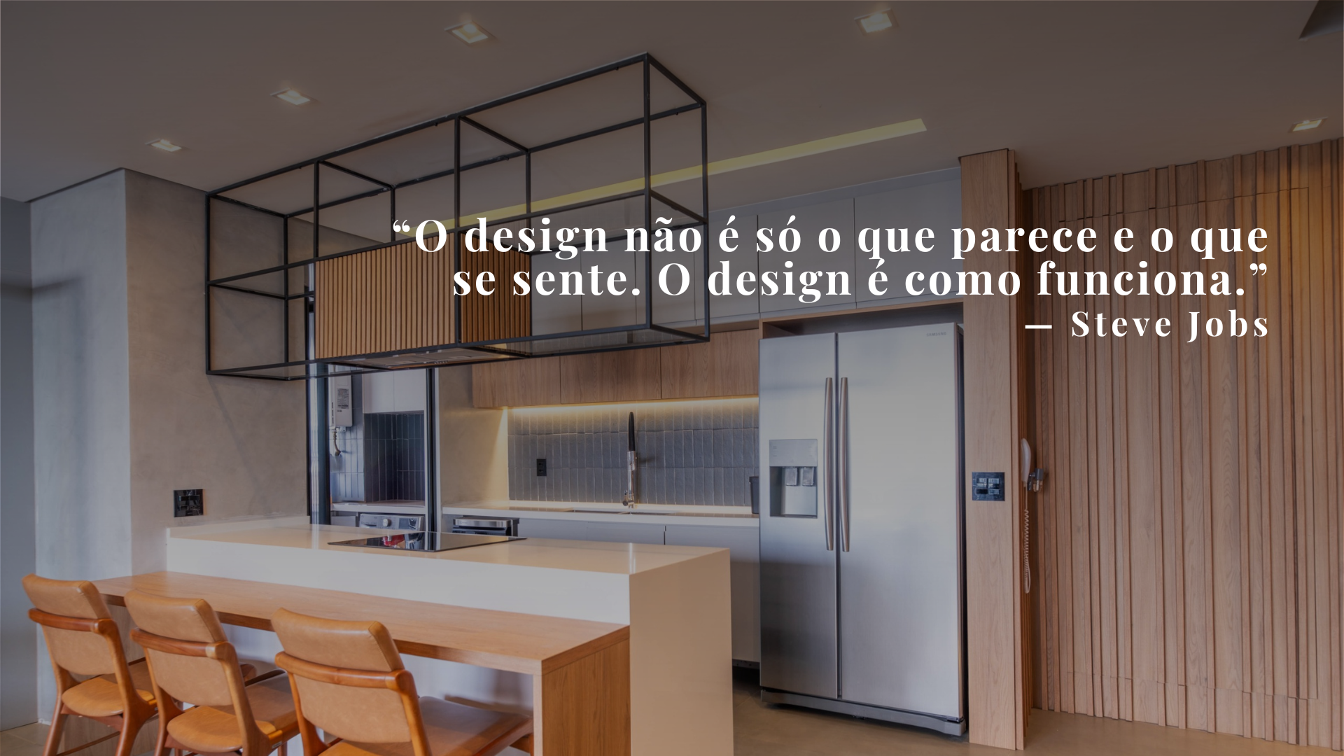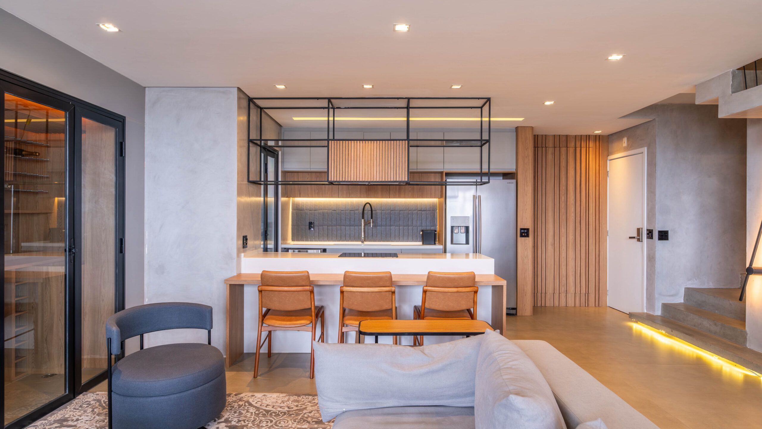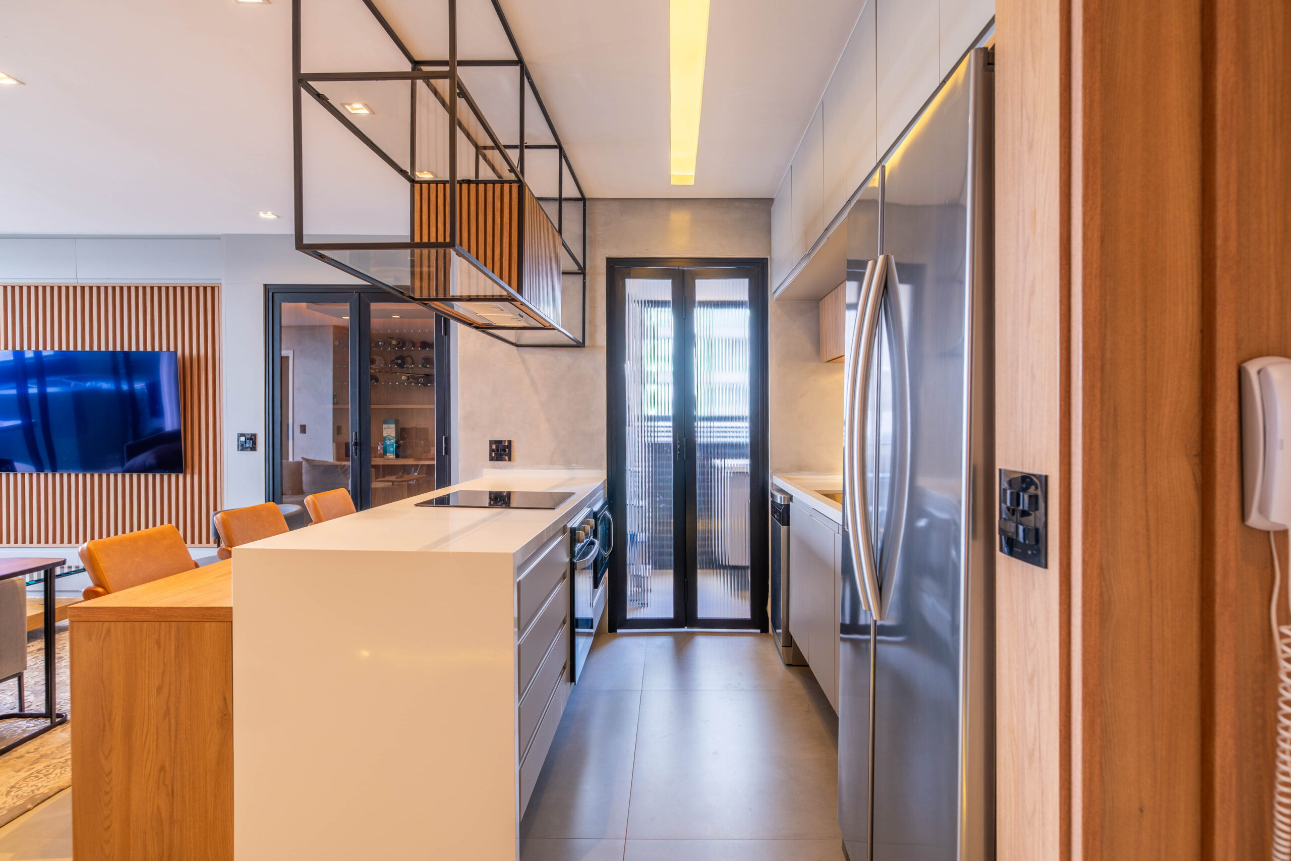 Projeto integrado de estar e cozinha, com marcenaria sob medida, estrutura metálica aparente, iluminação linear embutida e soluções funcionais que organizam os ambientes e valorizam a integração dos espaços.