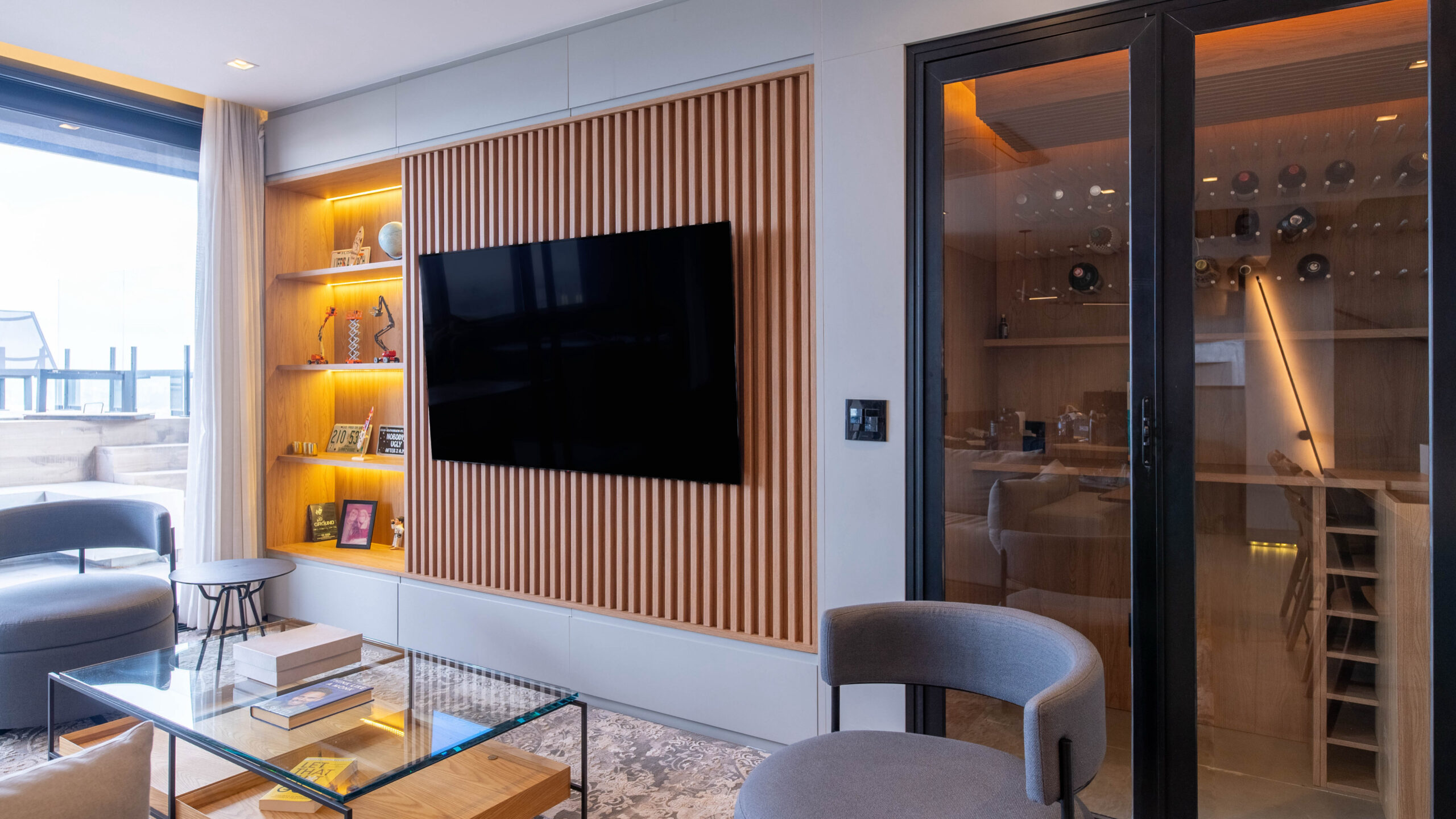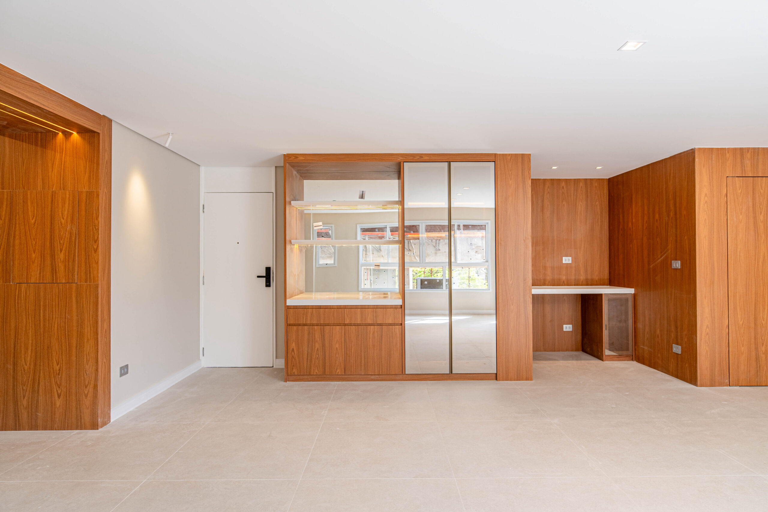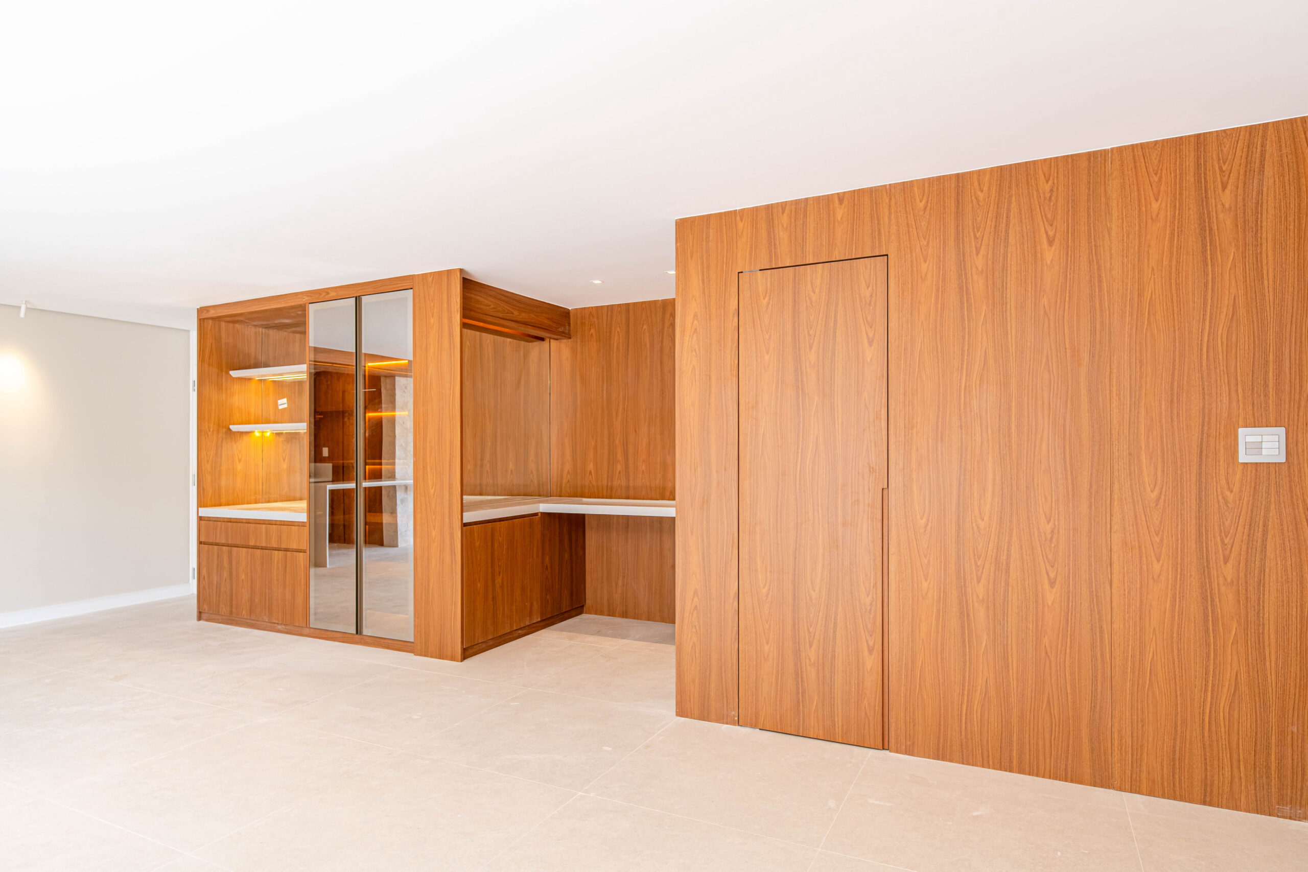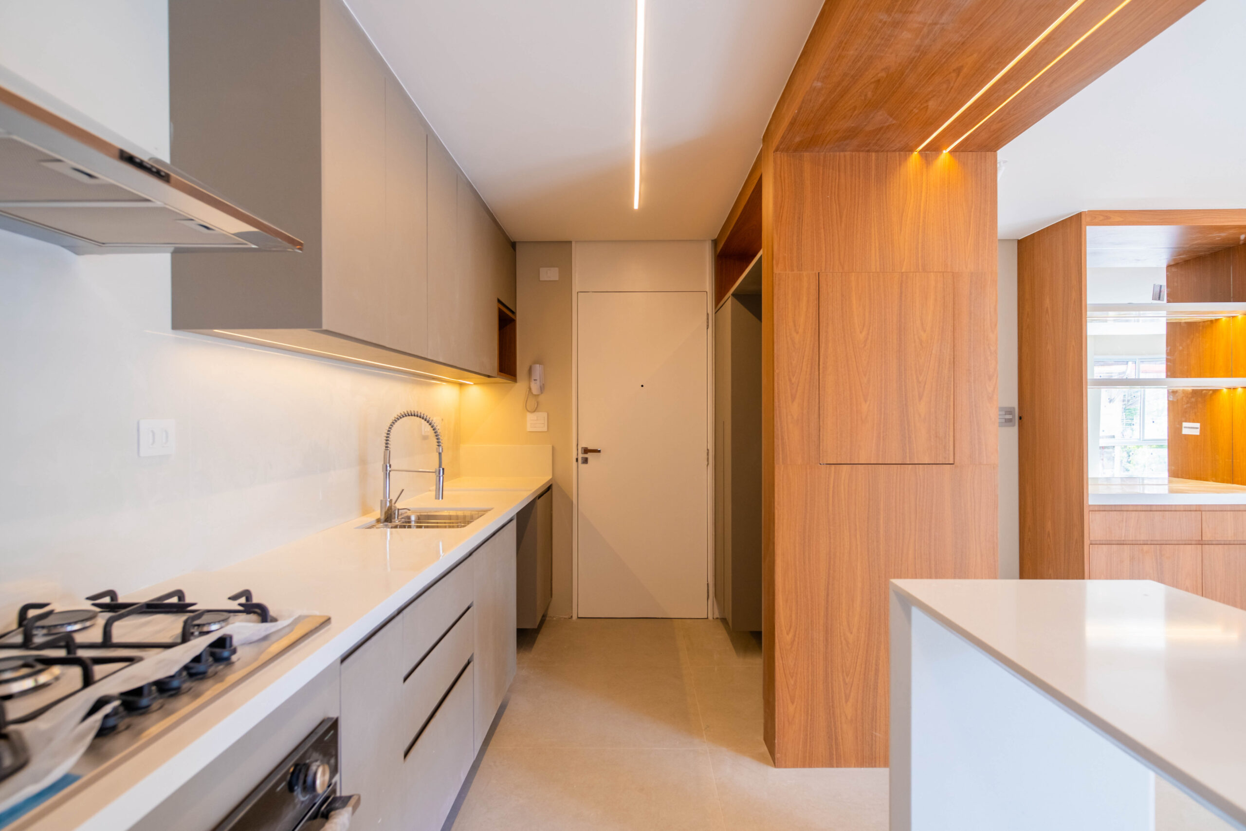 Projeto com marcenaria sob medida em padrão amadeirado, painéis integrados e soluções funcionais para cozinha, estar e área íntima, priorizando organização, fluidez e aproveitamento dos espaços.