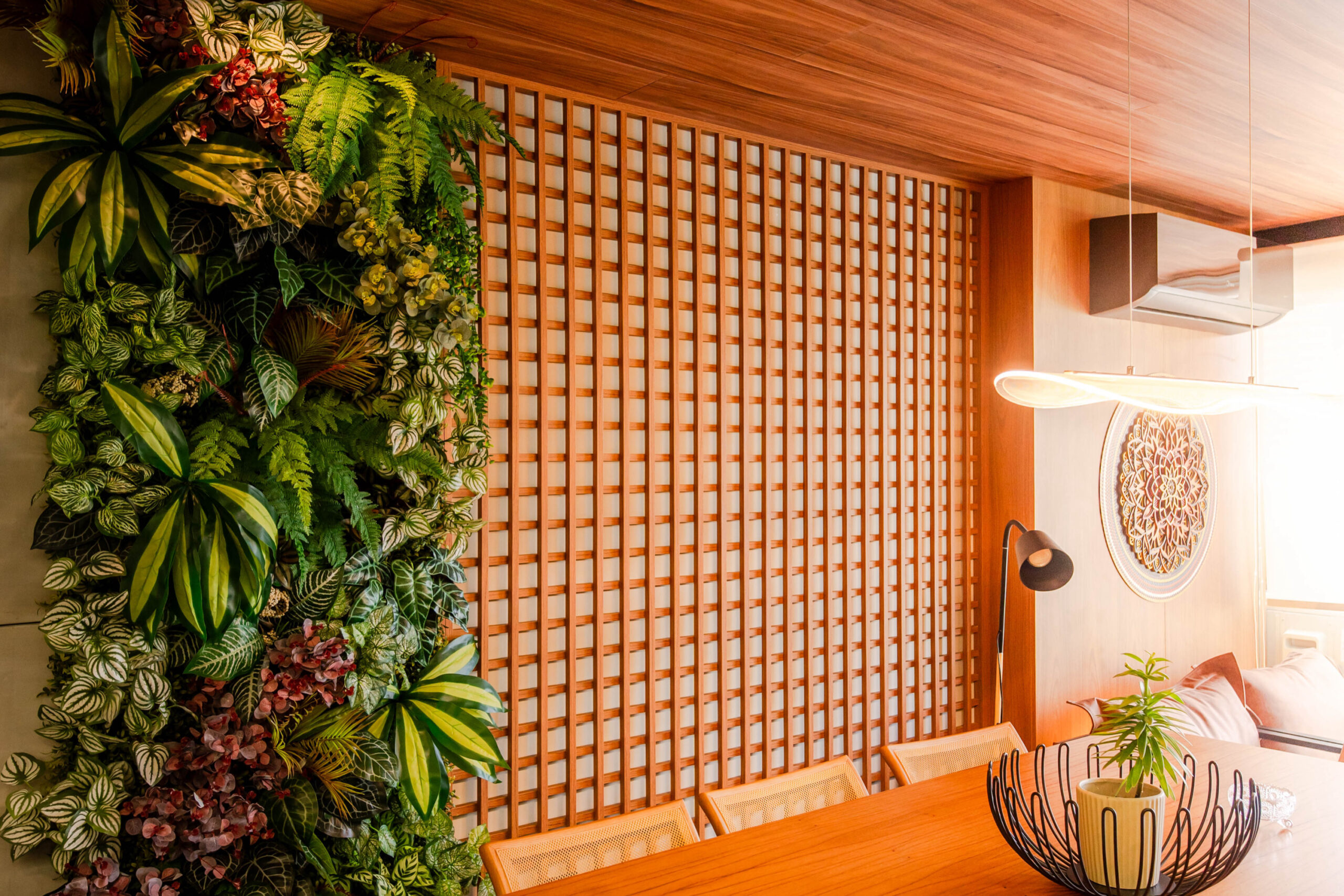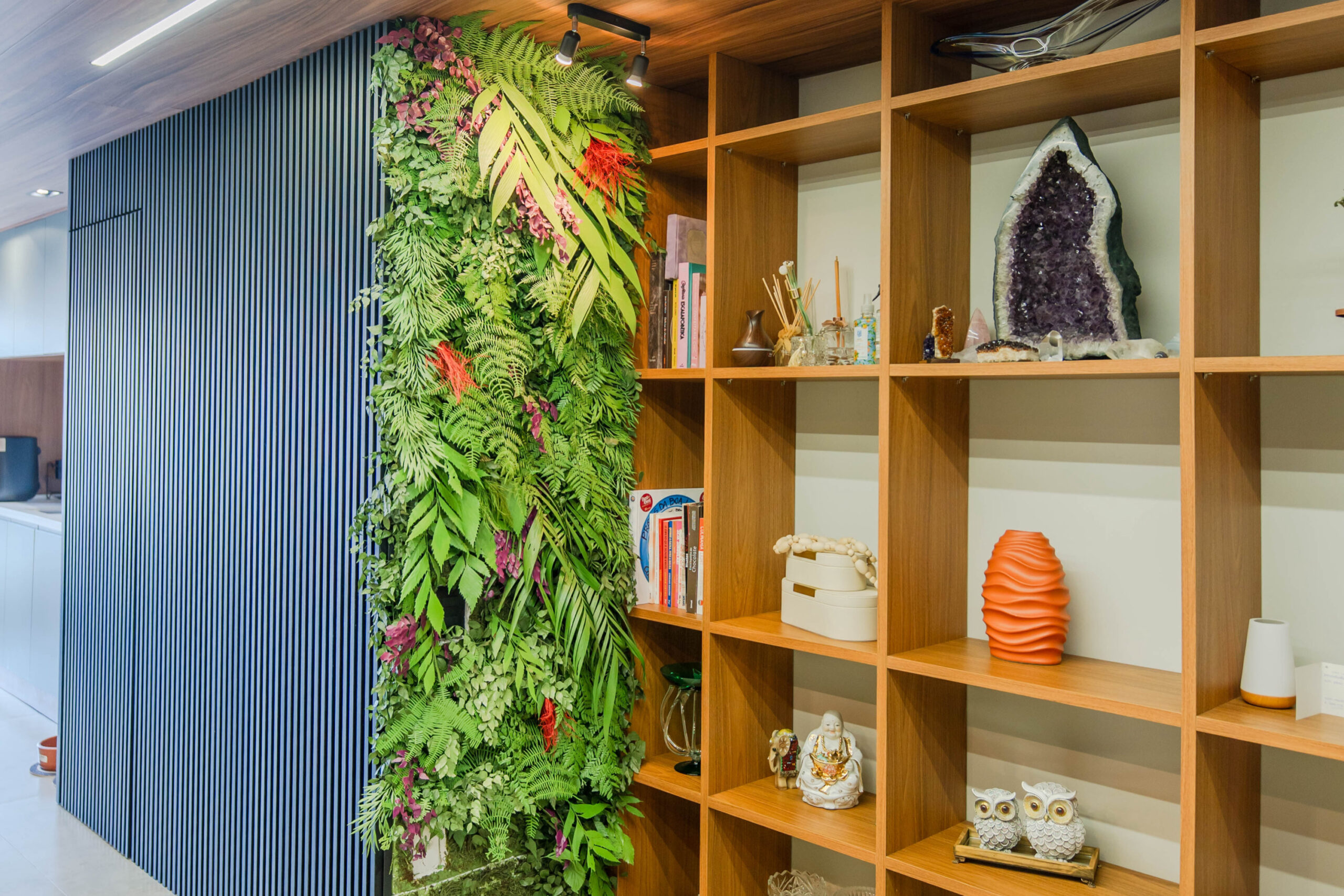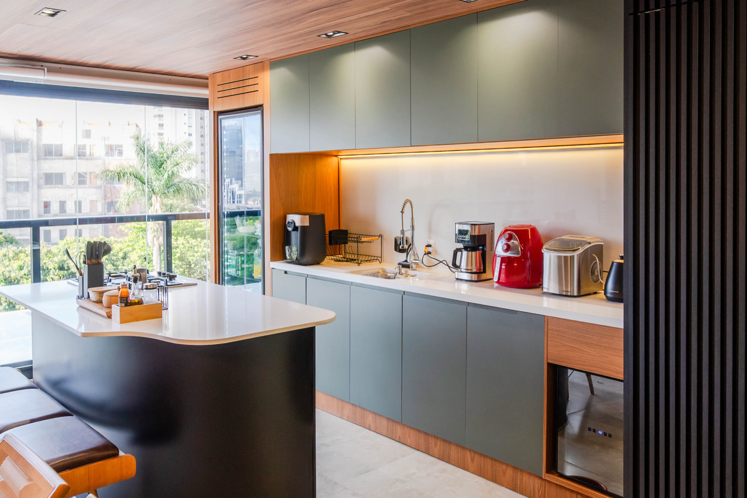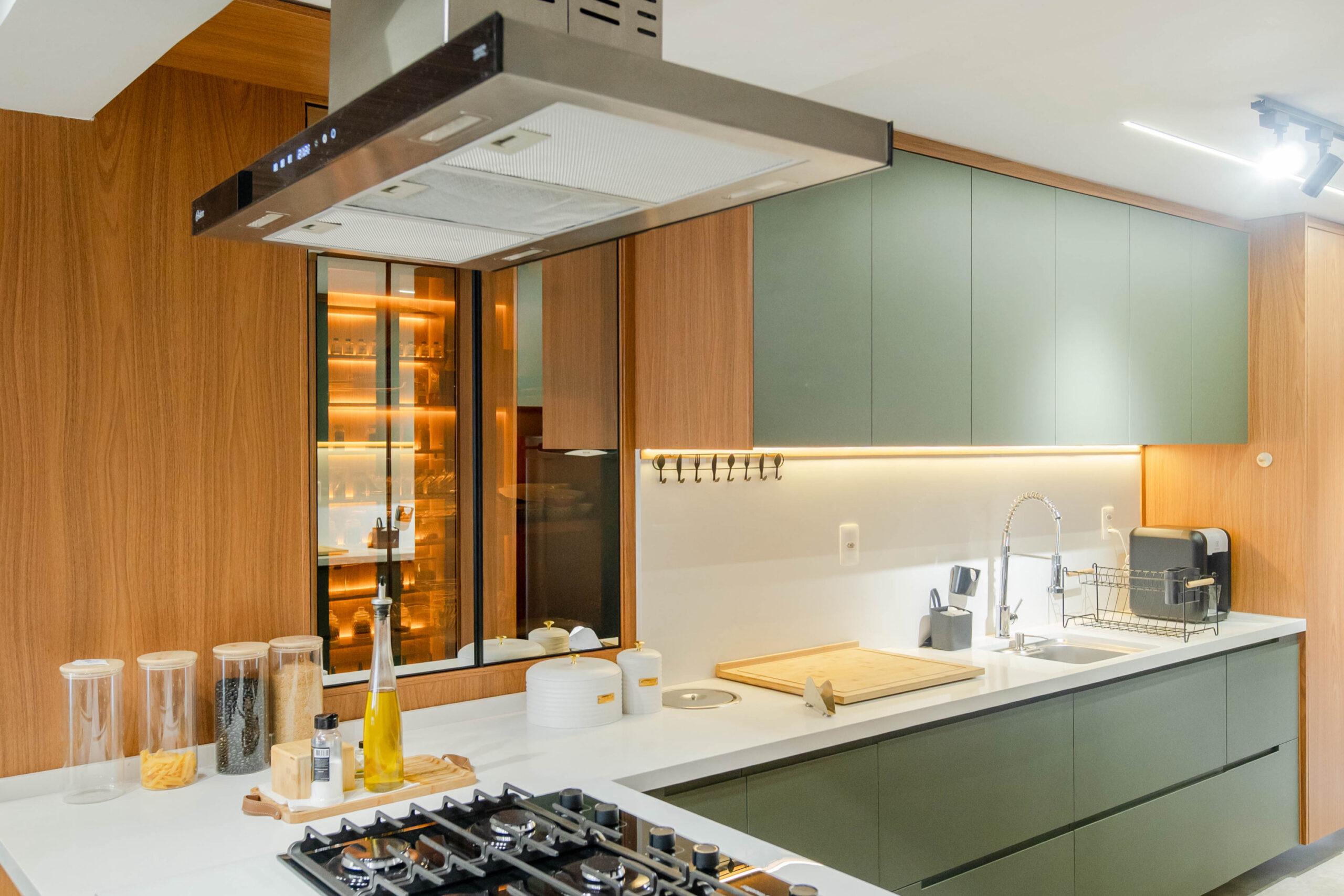 Projeto residencial com marcenaria sob medida, tons verdes e iluminação integrada, pensado para otimizar o uso dos espaços e criar uma atmosfera funcional e acolhedora.